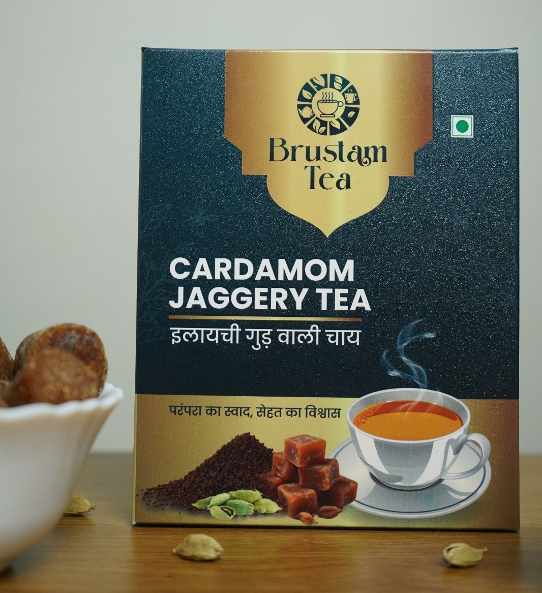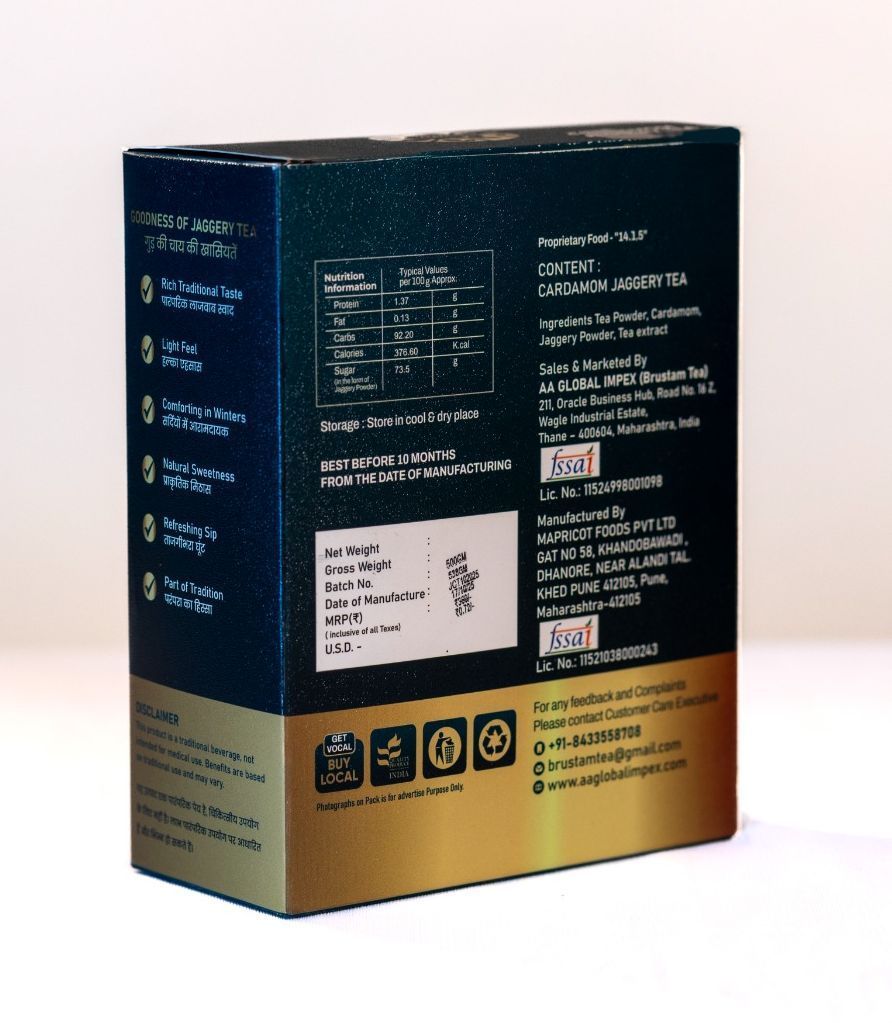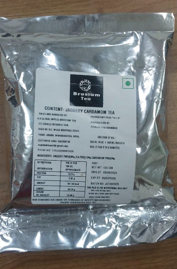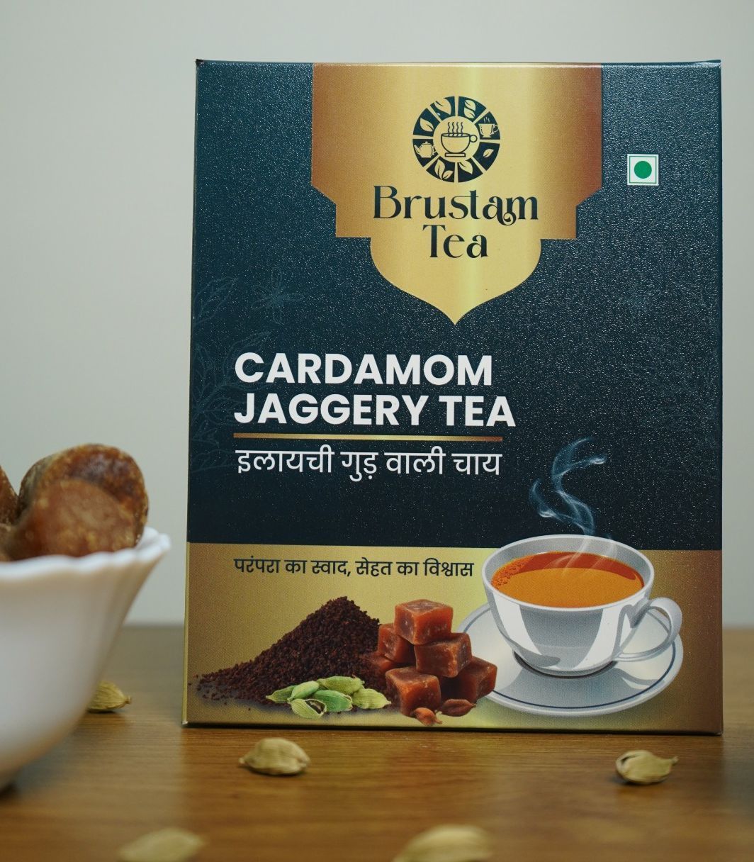 Brustam Cardamom Jaggery Tea is a pre-blended tea made from premium black tea powder, natural jaggery,and aromatic cardamom. The blend allows easy preparation using milk and water, eliminating the need for refined sugar. The mild cardamom aroma enhances the taste, making it a preferred choice for consumers seeking flavour along with natural sweetness. The product is suitable for domestic consumption as well as export markets.